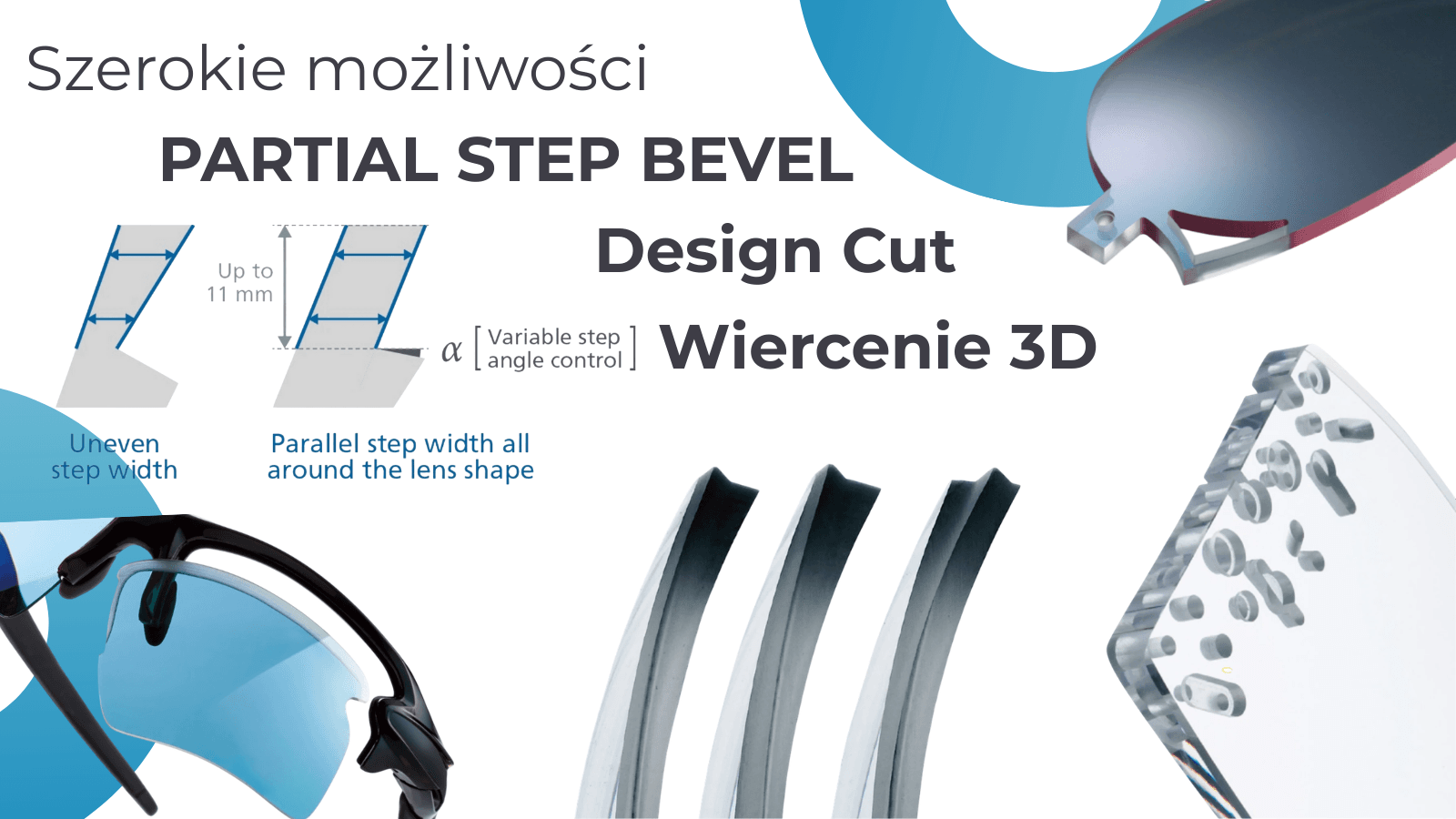 Funkcja fasety schodkowej STEP BEVEL ułatwia dopasowanie soczewek korekcyjnych do oprawek okularów przeciwsłonecznych i sportowych. Częściowa faseta schodkowa PARTIAL STEP BEVEL pozwala na precyzyjne zastosowanie w wyznaczonych obszarach, dzięki czemu idealnie nadaje się do specjalistycznych konstrukcji oprawek sportowych. Dzięki obsłudze soczewek o średnicy do ø90 mm i wysokości stopnia STEP BEVEL do 11 mm, MSE-1 z łatwością radzi sobie nawet z najbardziej wymagającymi zadaniami. Aby jeszcze bardziej zwiększyć precyzję, urządzenie MSE-1 wyposażono w funkcję regulacji kąta fasety schodkowej, która zapewnia jednolitą szerokość załamania na całym obwodzie soczewki.
